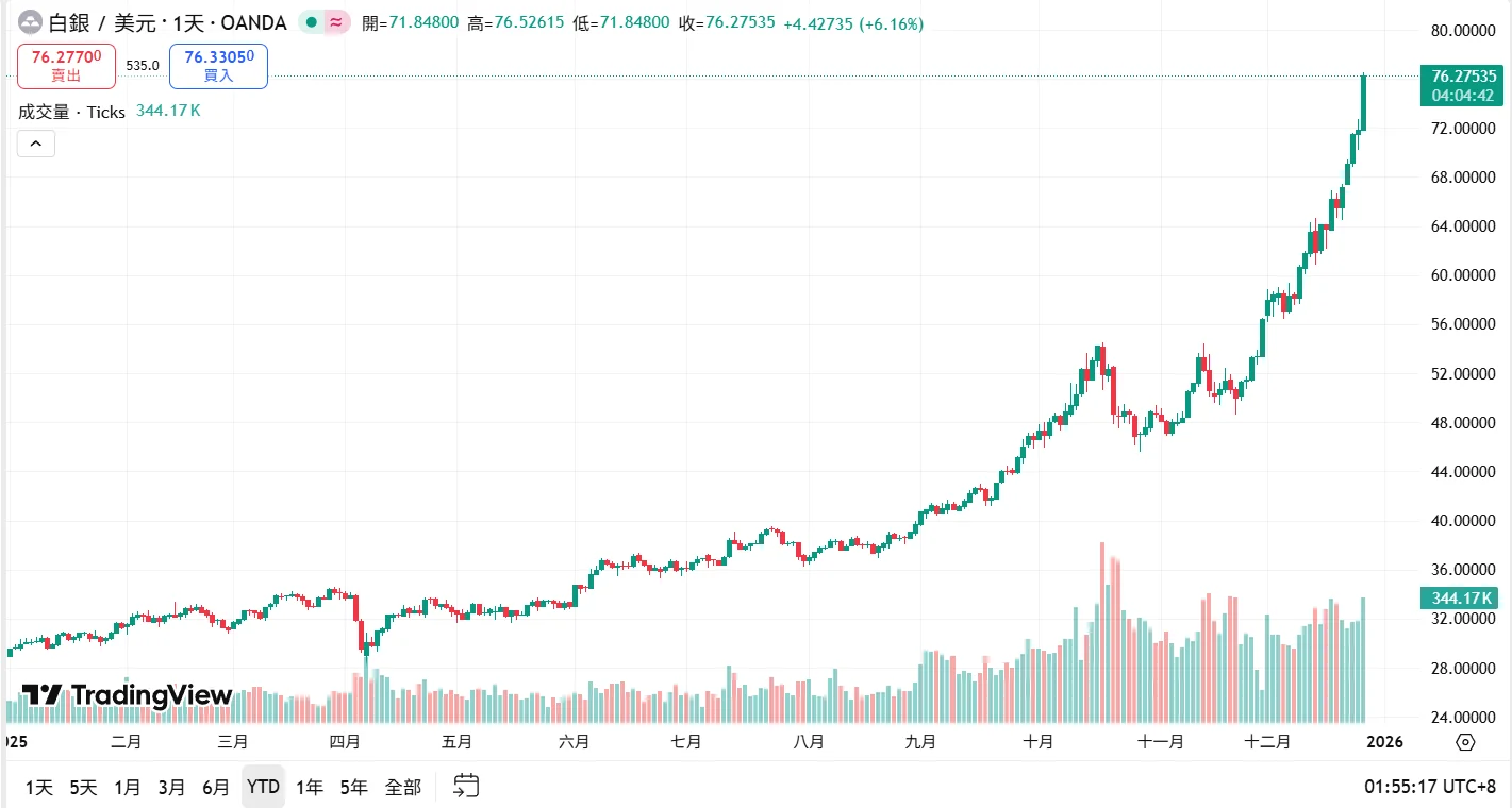 比特幣價格走勢疲軟,但貴金屬價格卻一路高歌猛進。本週五黃金價格升至每盎司4,580美元以上的歷史新高,白銀也突破每盎司75美元關口,創下歷史新高。自今年年初以來白銀價格已上漲約160%,黃金價格也累計上漲超過70%。