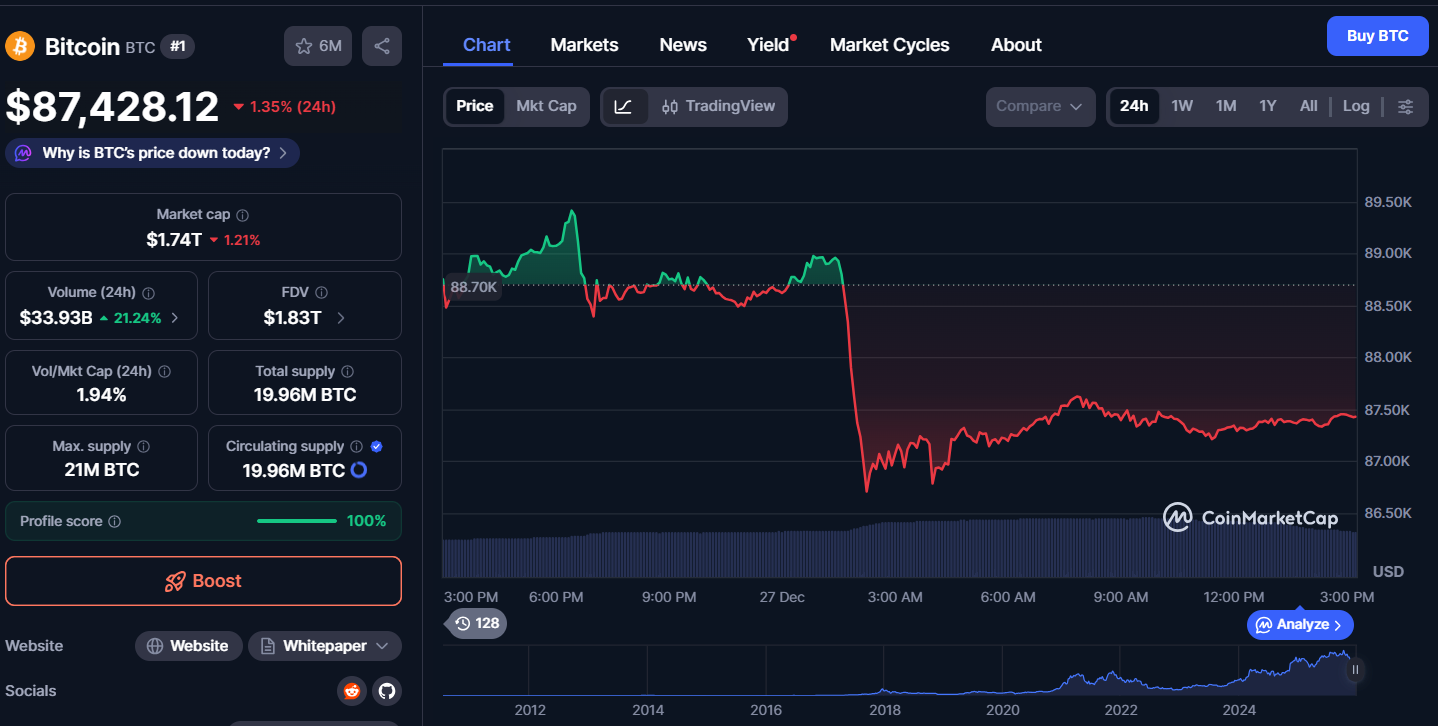 數據顯示比特幣價格在12月23日約為87,200美元,較今年年初的93,000美元下跌約6.5%。節日期間市場交投清淡,比特幣價格持續在9萬美元關口下方震盪。