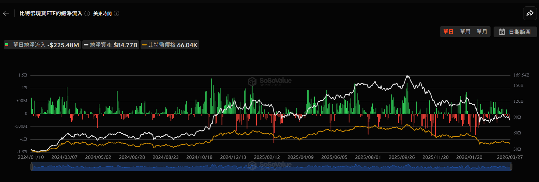 截至目前,比特幣價格約為 67,000 美元,較歷史高點 126,100 美元回落近 47%。同時,現貨比特幣 ETF 結束連續四週資金流入,單週轉為約 2.96 億美元淨流出,顯示機構資金動能轉弱。在宏觀層面,地緣政治風險與通膨壓力持續升溫,也進一步壓抑市場風險偏好。