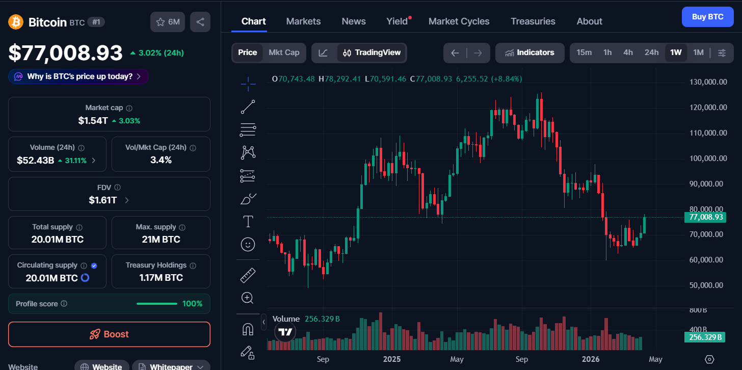 在消息公布後,比特幣(BTC)快速上漲,突破 77,000 美元關口,24 小時漲幅超過 3%,週線亦回升約 5%。市場觀察指出,隨著地緣政治壓力減弱,投資人風險偏好明顯回升,資金重新流入加密市場與股市。同時,美股標普 500 指數在過去三週內累計增加約 7 兆美元市值,顯示整體市場正在從此前的恐慌情緒中恢復。