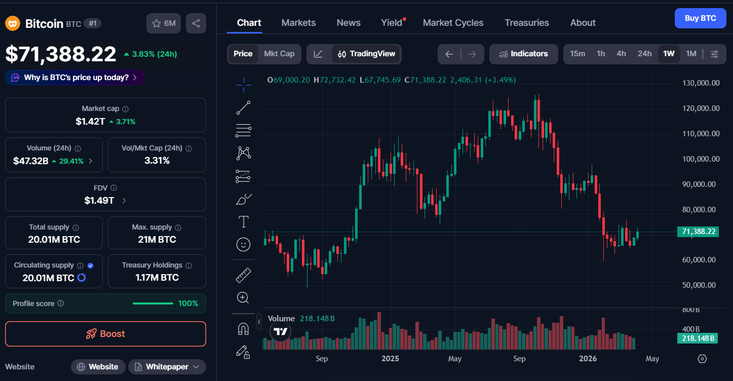 比特幣當日一度突破72,700美元,創下自3月中旬以來新高,截稿前約報71,388.22美元,24小時漲幅達3.83%。以太幣同步上漲6%至2,236.66美元,XRP與Solana亦分別上漲3.5%與6.5%,整體加密市場單日漲幅接近4%。