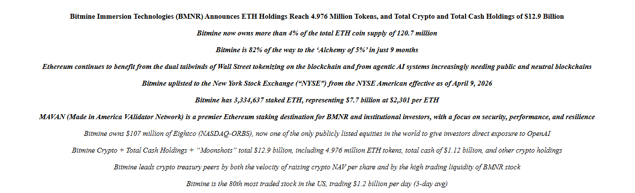 Bitmine Immersion Technologies 公布,於 4 月 13 日至 4 月 19 日期間增持 101,627 枚 ETH,這也是該公司自 2025 年 12 月 15 日以來最大的一筆單週以太坊買盤。根據公司新聞稿及同步提交給美國證券交易委員會(SEC)的 Form 8-K 文件,最新買進後,Bitmine 的 ETH 總持倉已來到 4,976,485 枚。