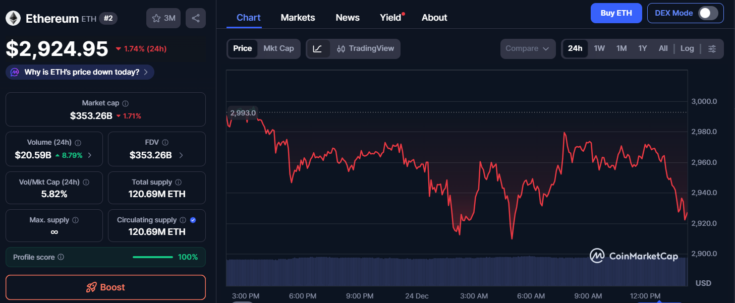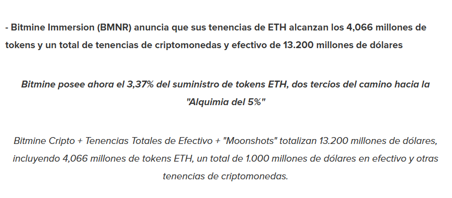 根據BitMine於12月22日發布的最新公告,截至12月21日,其持有4,066,062枚ETH佔以太坊總供應量的3.37%,總價值超過120億美元。