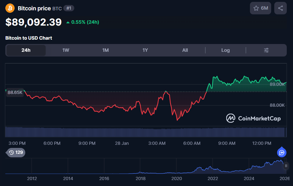在全球金融市場震盪背景下,加密貨幣出現技術性反彈。比特幣於 28 日清晨一度下探 87,200 美元,隨後快速拉升並突破 89,000 美元關卡,價格一度來到約 89,219 美元,顯示下方買盤支撐仍具韌性,市場進入橫盤整理、觀察後續方向的階段。