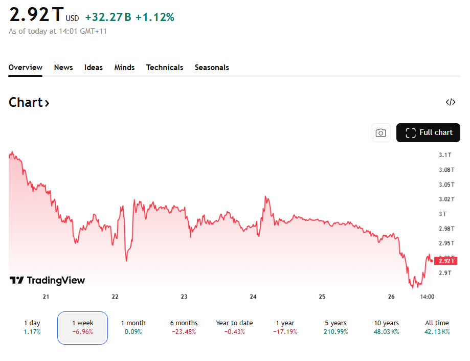 在政治不確定性升高下,加密市場於週日出現明顯賣壓。根據 TradingView 數據,加密貨幣總市值在約 6 個半小時內,從 2.97 兆美元下滑至 2.87 兆美元,單日蒸發約 1,000 億美元。