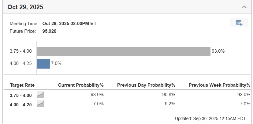 8月核心PCE年增率符合預期,市場對聯準會繼續降息的押注火速升溫。芝商所FedWatch顯示,10月會議降息1碼的機率逼近90%,12月再降1碼的可能性也近70%。美元指數29日回落0.3%,削弱美元吸引力,讓黃金更顯便宜。