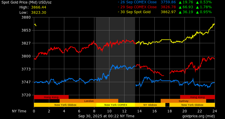美國政府關門危機與聯準會降息預期推升避險需求,國際黃金價格今晨逼近每盎司3,850美元歷史新高