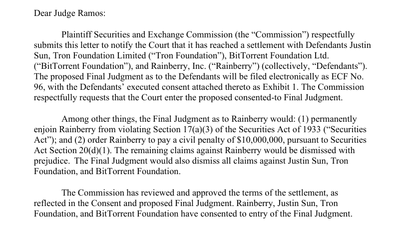 美國證券交易委員會(SEC)近日向紐約曼哈頓聯邦法院提交文件,宣布與加密企業家孫宇晨(Justin Sun)達成和解協議。根據內容,孫宇晨旗下公司 Rainberry 同意支付 1,000 萬美元罰款,而 SEC 則將撤回對孫宇晨本人,以及 TRON Foundation 與 BitTorrent Foundation 的相關訴訟。