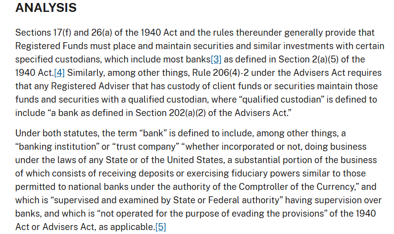根據信函內容,在1940年投資顧問法案及其附則下運作的機構,在放置和維護加密資產、現金和/或為進行加密資產交易而合理需要的現金等價物方面,可被視為 "銀行"。換句話說,與州信託公司合作的特定金融實體,如註冊投資顧問和受監管基金,似乎能夠持有和管理比特幣和以太坊等加密貨幣,如同管理現金一樣。