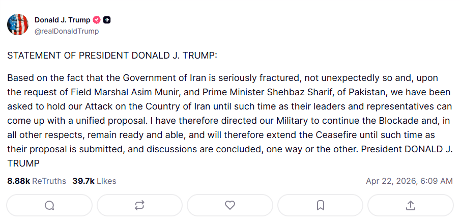 在中東局勢一度逼近全面衝突之際,川普最新聲明為市場與國際社會帶來喘息空間。美方決定暫時取消原先針對伊朗的軍事打擊計畫,並延長既有停火安排。川普指出,此決定主要源自巴基斯坦高層的積極斡旋,包括陸軍參謀長Asim Munir與總理Shehbaz Sharif的直接請求,促使美方暫時踩下軍事煞車。
