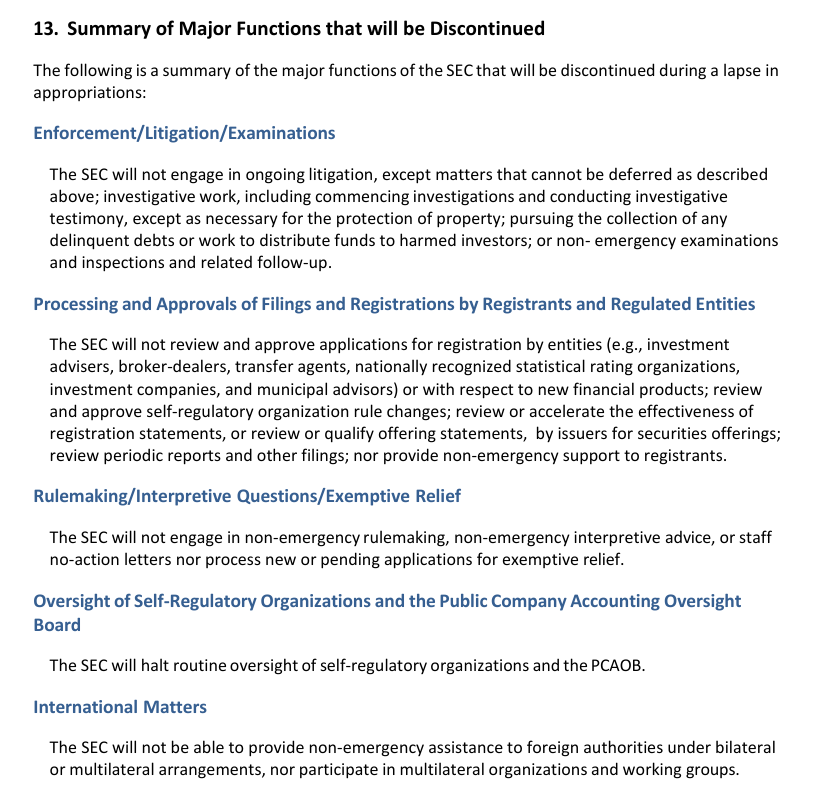 自川普政府於1月上任以來,SEC一直在權衡為新加密產品提供豁免救濟,並為提供代幣化股票的數字資產公司提供類似救濟。但現在由於政府關門,這些救濟措施以及其他與加密相關的變革都無法取得進展。