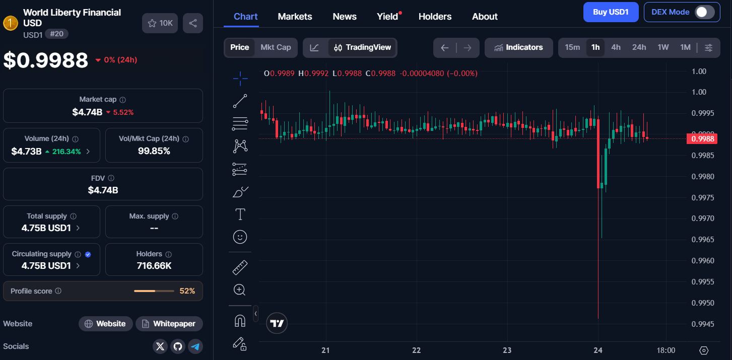 不過 WLFI 表示,USD1 採取完整的 1:1 儲備支持機制,資產包括美國國債與現金等高流動性標的,並透過 mint-and-redeem(鑄造與贖回)機制維持平價。官方指出,價格僅在數分鐘內即恢復至 1 美元附近,整體流動性未見擠兌或贖回失序情況。