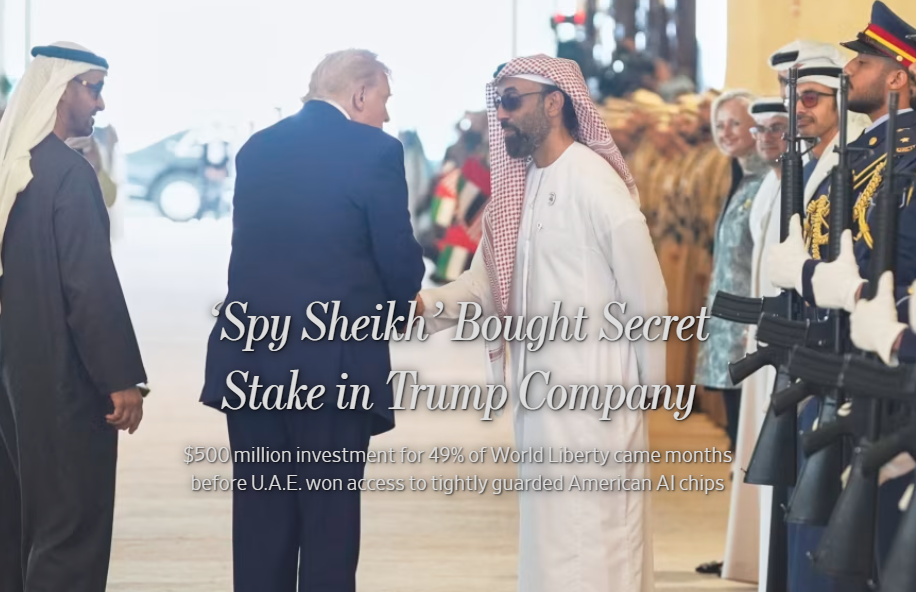今年 1 月,《華爾街日報》披露,一家註冊於阿拉伯聯合大公國的投資載體 Aryam Investment 1,以 5 億美元購入 WLFI 49% 股權。該投資工具由阿聯酋國家安全顧問謝赫塔赫農(Sheikh Tahnoon bin Zayed Al Nahyan)支持,交易時間點距離川普於 2025 年 1 月 20 日就職僅四天。此舉引發民主黨籍眾議員 Ro Khanna 要求調查,強調「公共信任與透明度」的重要性。川普則表示不清楚交易細節,稱相關業務由其子女與家族處理。
